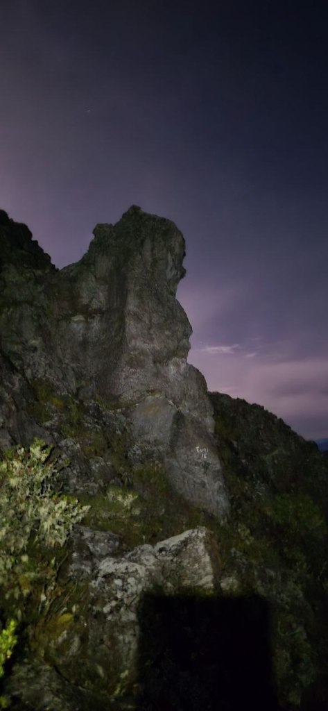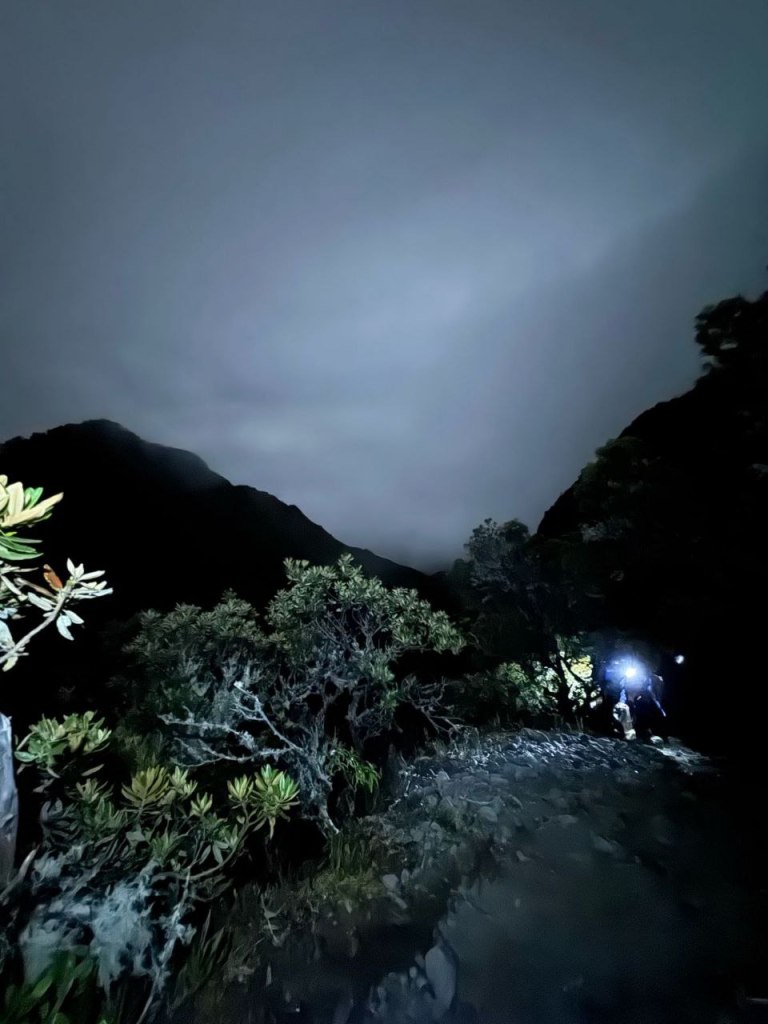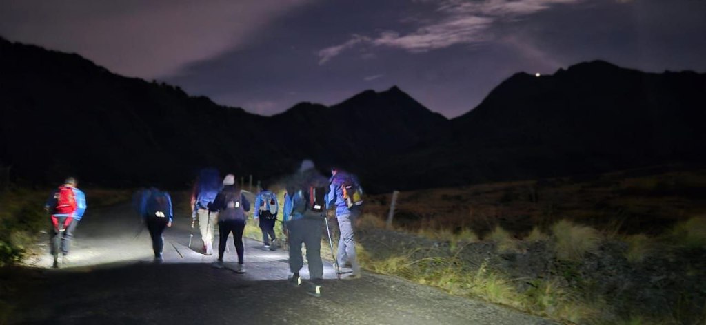 La noche era clara. El cielo, completamente estrellado, parecía dar la bienvenida a esta expedición, mientras la luna, brillante y cómplice, iluminaba el camino serpenteante entre árboles, piedra y silencio. La ruta comenzó con una inclinación desafiante: cerca de 5.8 metros horizontales por cada metro de elevación. Los primeros kilómetros demandaban fuerza en las piernas, determinación y buen ritmo.