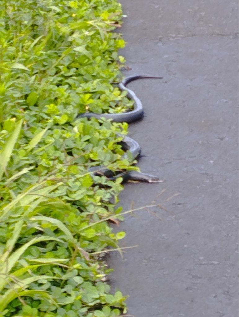 Durante mis entrenamientos recientes, me encontré con otra serpiente. A diferencia de otras ocasiones, esta era inofensiva para el ser humano, probablemente clelia clelia. En esta zona, los bordes de la carretera están cubiertos de hierba alta y hay varios afluentes cercanos, lo que la convierte en un corredor natural para serpientes —tanto víboras como culebras—, especialmente en temporada lluviosa. Aunque la otra serpiente que vi no era venenosa, su color oscuro y el entorno descuidado podrían asustar fácilmente a alguien que no la espere, provocando una reacción brusca que incluso podría llevarlo a lanzarse hacia la vía y causar un accidente.