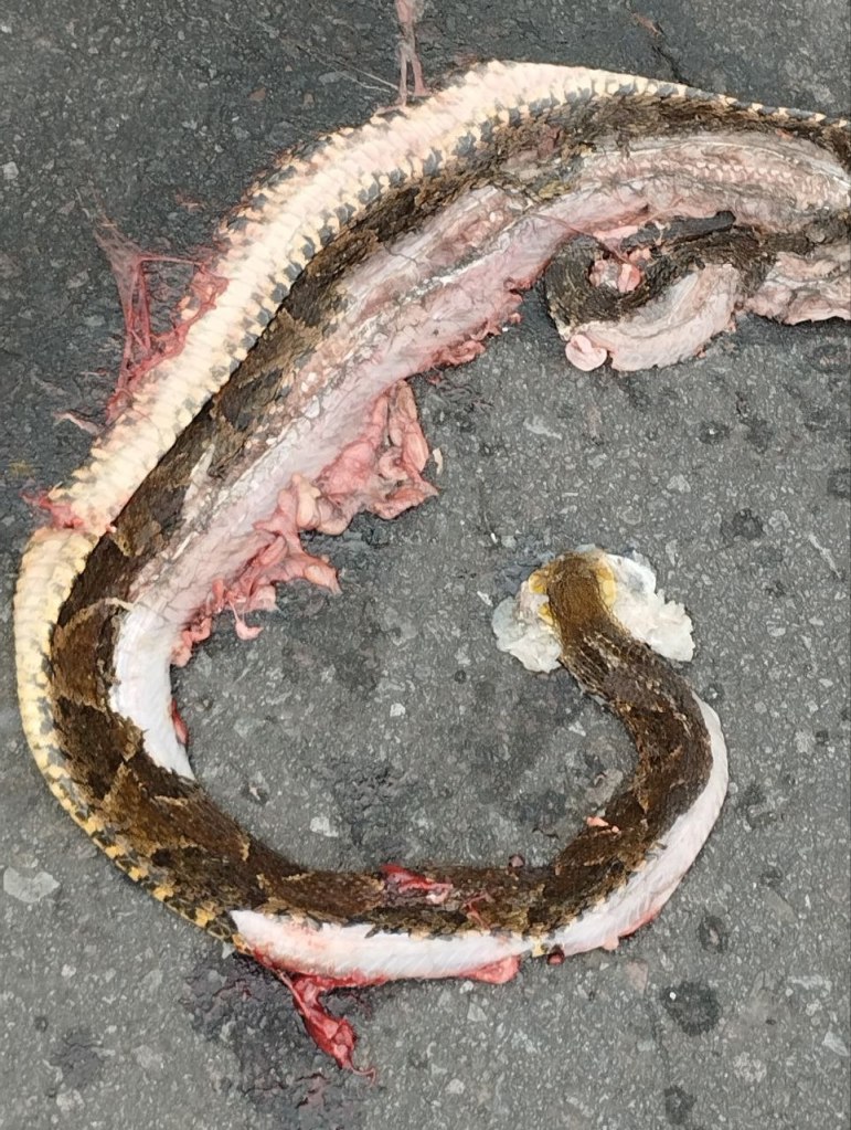 Esta mañana decidí extender mi recorrido y crucé el puente en un punto diferente al habitual. Fue al regresar cuando vi la víbora recién atropellada justo en el lugar donde usualmente suelo cruzar.