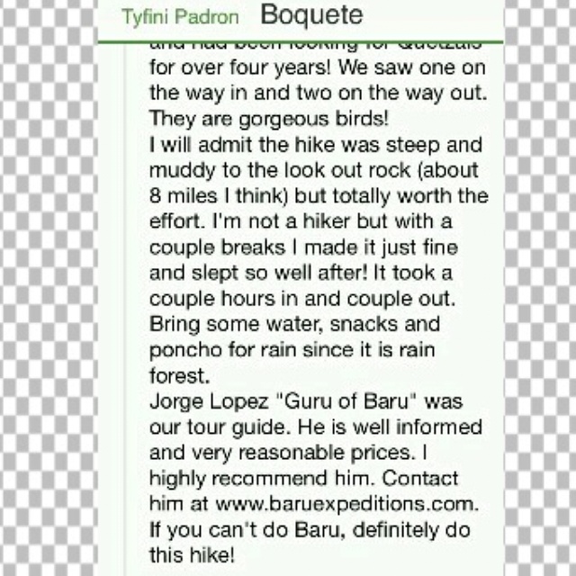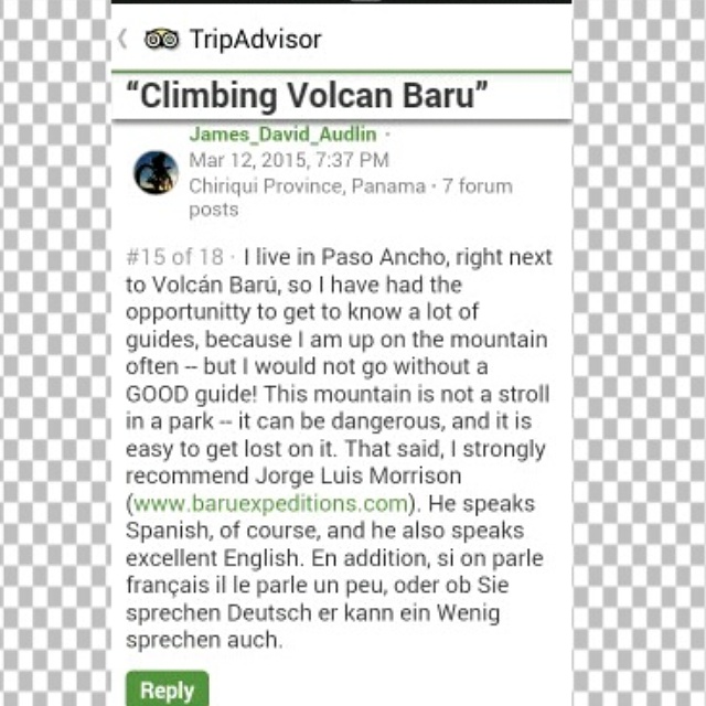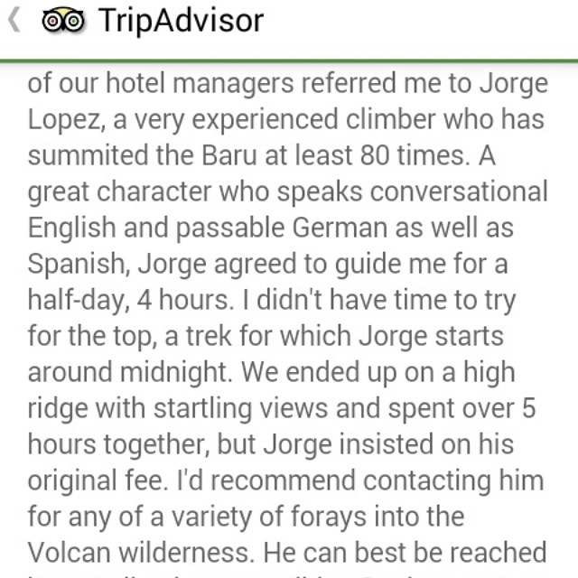 our hotel manager referred me to jorge lopez, a very experienced climber who has summited the baru at least 80 times. A great character who speaks conversational English and passable German as well as spanish, Jorge agreed to guide me for a half-day, 4 hours. i didn t have time to try for the top, a trek for which Jorge starts around midnight. we ended up on a high ridge with startling views and spent over 5 hours together, but jorge insisted on his original fee. i d recommend contacting him for any of a variety of forays into the volcan wilderness.